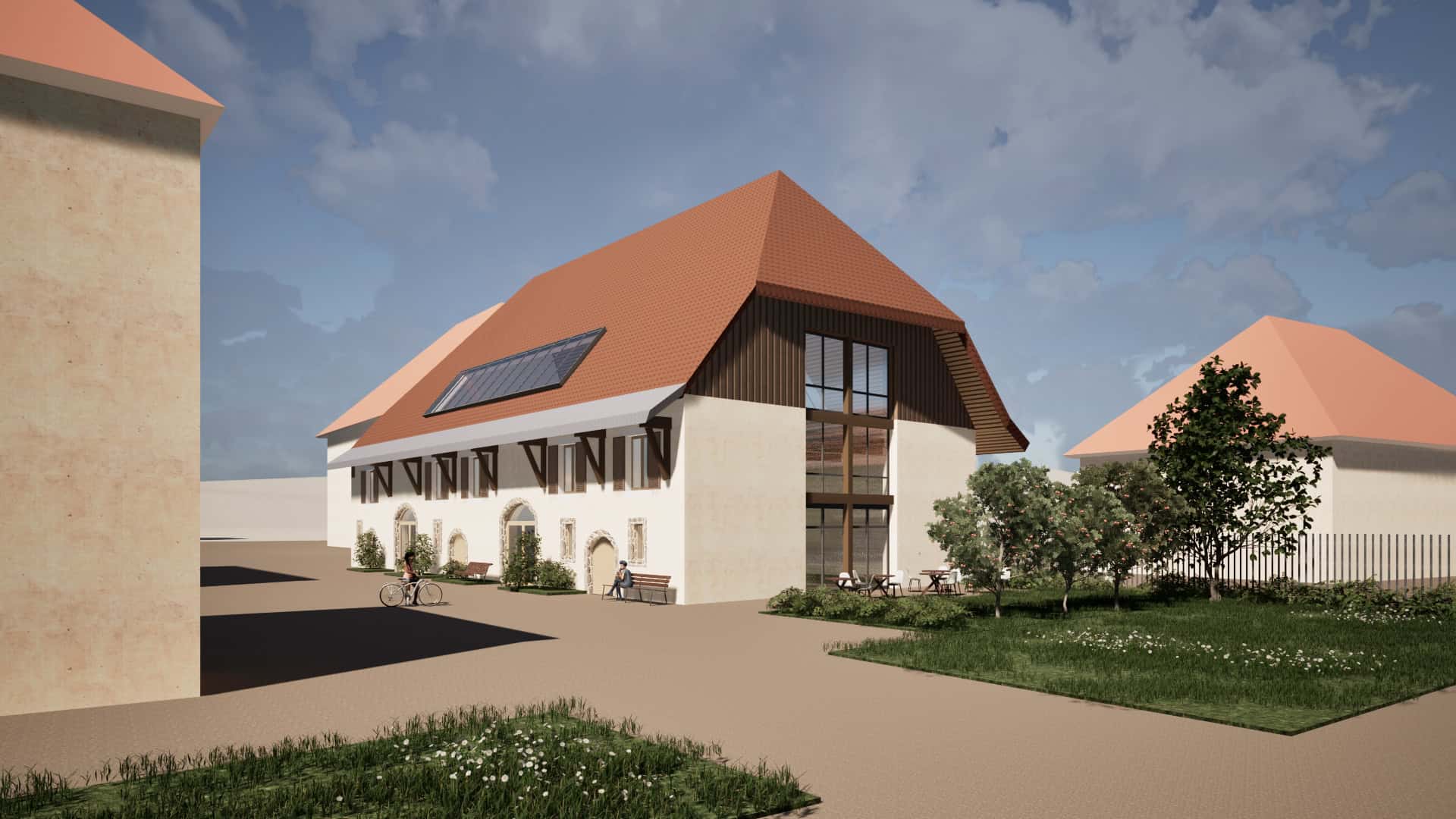 Ce bâtiment patrimonial sera entièrement rénové pour devenir un lieu accessible, lumineux, accueillant et ouvert sur son environnement, tout en respectant l’existant : murs en pierre, charpente traditionnelle, volumes généreux.